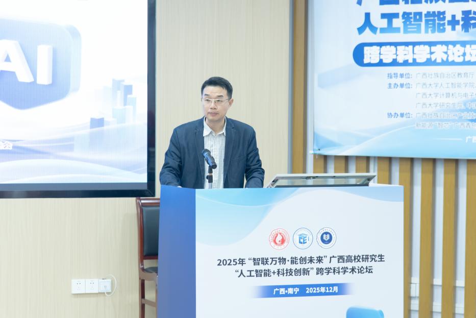联合校团委、研究生院等单位共同主办的“智联万物·能创未来”广西高校研究生人工智能+科技创新跨学科学术论坛在我校顺利开幕。本次论坛由广西壮族自治区教育厅立项资助,广西高等教育学会人工智能与机器人专委会、新能源“智芯”广西青创空间和中国计算机学会南宁分部等单位协办,汇聚了区内外人工智能及相关领域的知名专家学者,吸引了来自肉视频