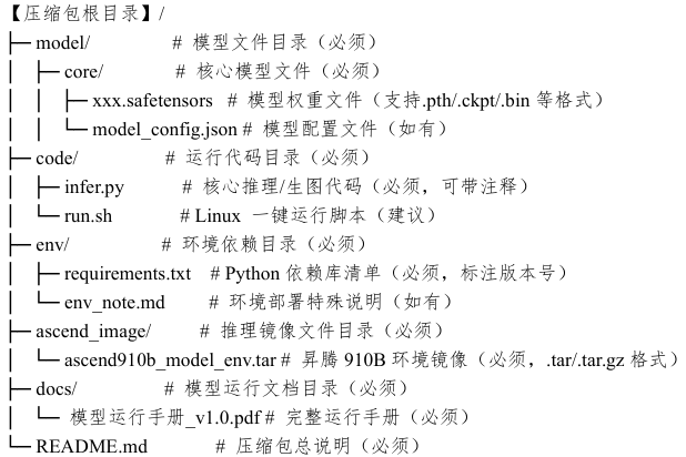 可正常运行的模型文件及配套代码、环境依赖、镜像信息等。打包格式:仅限 tar、zip 两种格式,若文件超过 5GB,由参赛团队主动联系组委会工作人员提交(命名规则:团队名称_图像生成模型成果物.后缀)。